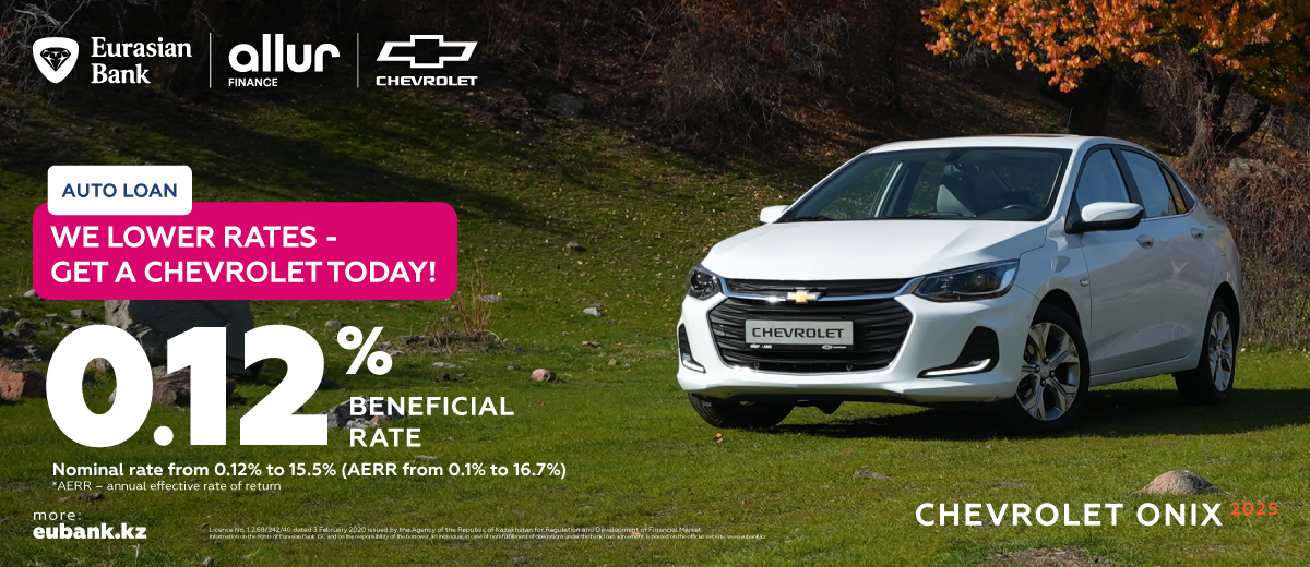 Eurasian Bank has a special offer for Chevrolet Onix car — a loan with a nominal rate starting from 0.12% (AERR 0.1%).