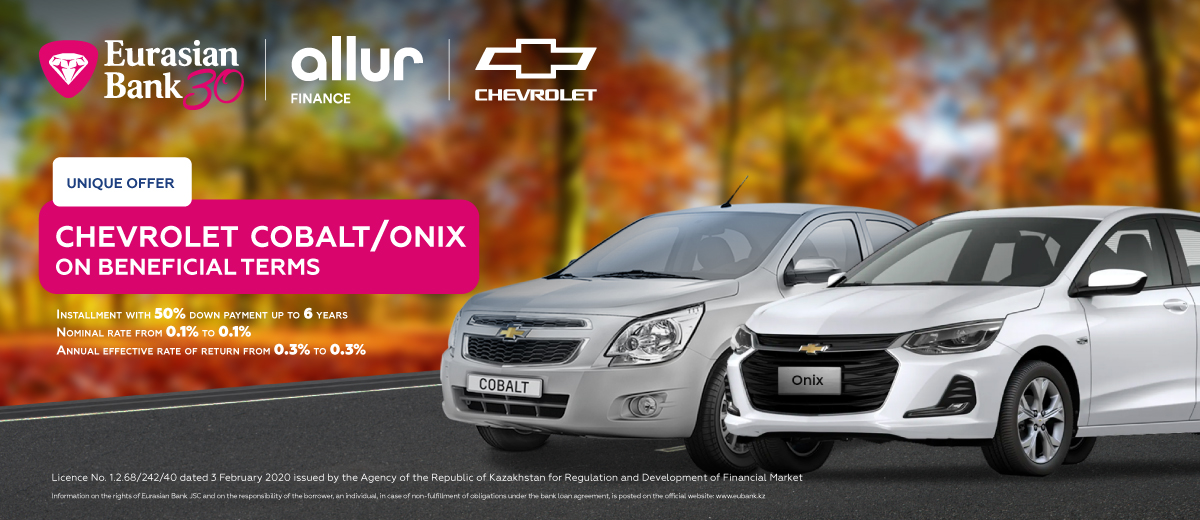 Eurasian Bank, together with Allur Finance and the Chevrolet brand, present a unique offer – a loan for the purchase of Chevrolet Cobalt and Chevrolet Onix cars with a nominal rate of only 0.1%!