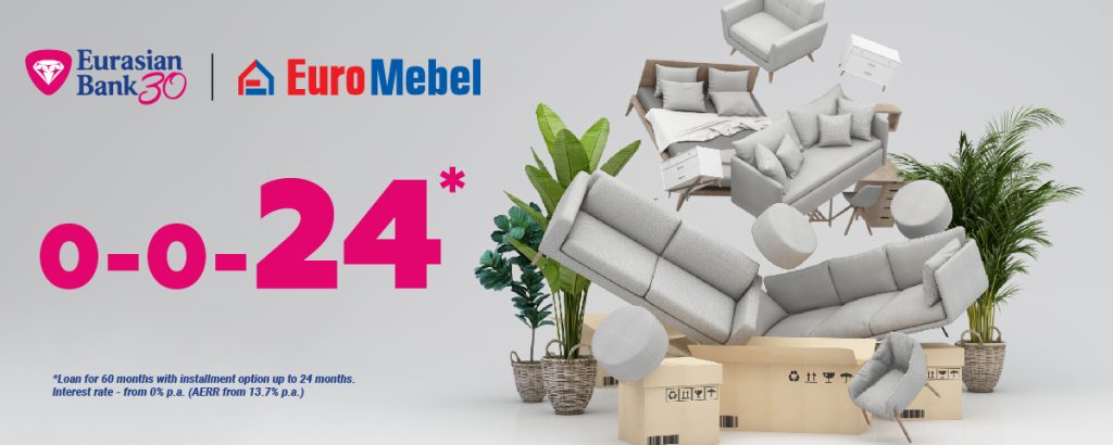 Eurasian Bank announces the launch of a joint campaign with the EuroMebel furniture salon chain. Now the Bank customers have a unique opportunity to equip their home with modern and stylish furniture, taking advantage of beneficial loan terms with an installment option under the Grace 24-60 Program.