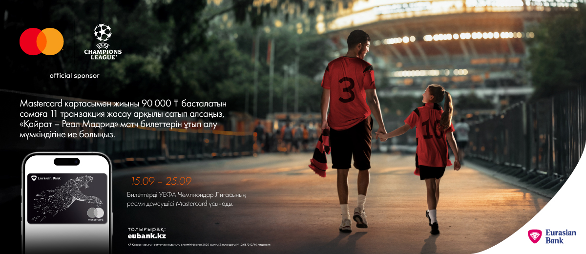 Еуразиялық банк халықаралық Mastercard төлем жүйесімен бірлесіп, “Футболға Mastercard-пен бірге барамыз” науқанын іске қосады. Бас жүлде – 2025 жылғы 30 қыркүйекте өтетін “Қайрат-Реал-Мадрид” тарихи матчының билеттері.