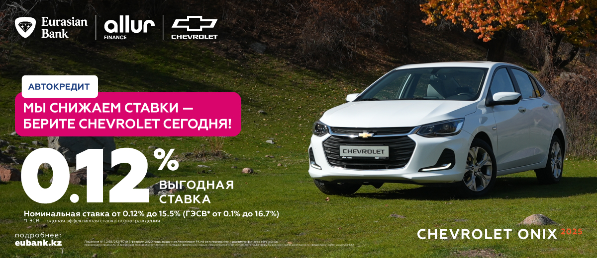 Евразийский банк предлагает специальное предложение на автомобиль Chevrolet Onix — кредит с номинальной ставкой от 0,12% (ГЭСВ 0,1%).