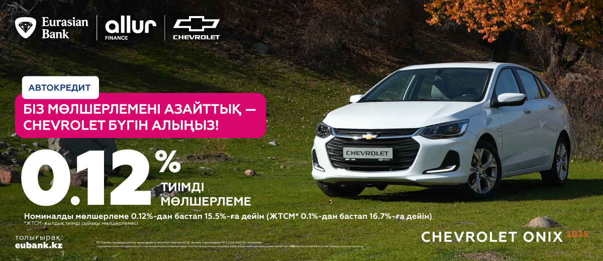 Еуразиялық банктің 0,12% номиналды мөлшерлемелі Chevrolet Onix автокөлігі бойынша арнайы ұсынысы бар (ЖТСМ 0,1%).