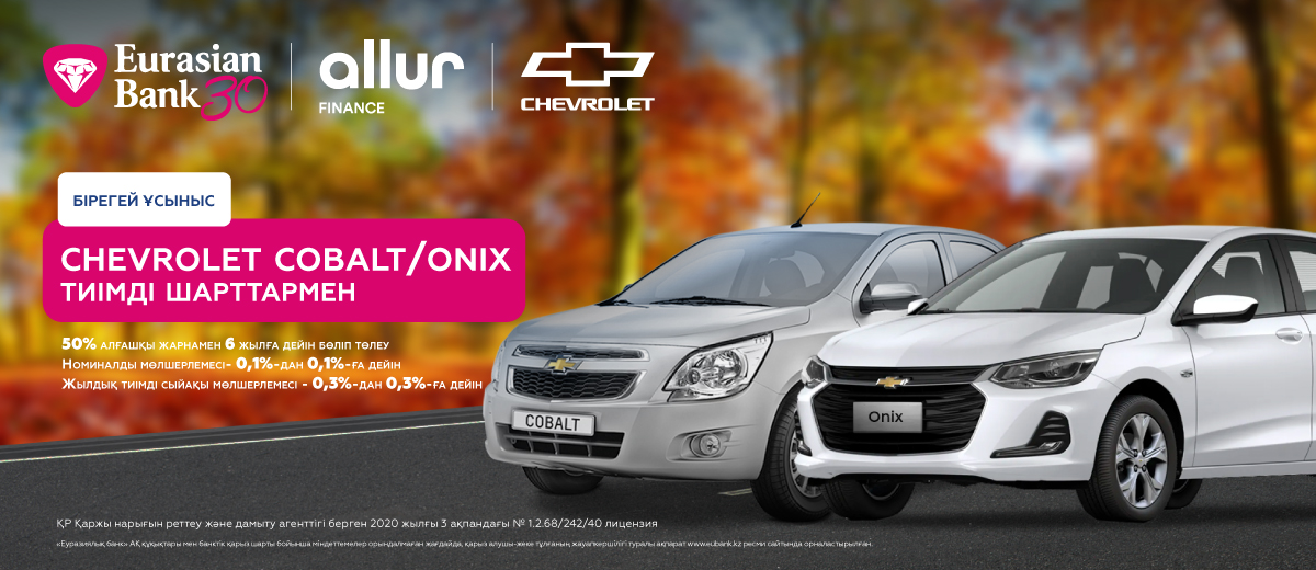 Еуразиялық банк Allur Finance және Chevrolet брендімен бірлесіп бірегей ұсыныс – Chevrolet Cobalt және Chevrolet Enix автокөліктерін сатып алуға номиналды мөлшерлемесі небәрі 0,1%-дан басталатын кредит ұсынады!