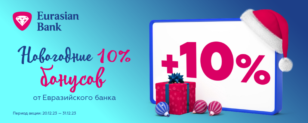 В преддверии Нового года в период с 20 по 31 декабря 2023 года Евразийский банк дарит своим клиентам 10% бонусов!