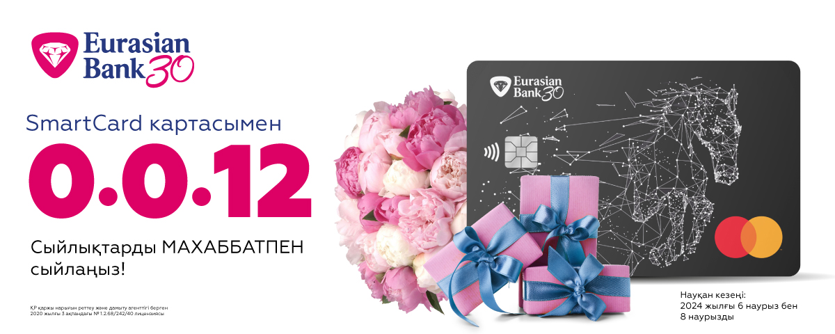 Халықаралық әйелдер күніне орай Еуразиялық банк «SmartCard кредиттік картасы бойынша 0-0-12 бөліп төлеумен тиімді сатып алулар» акциясын бастайды. Тек үш күн, яғни 2024 жылғы 6 наурыздан бастап 8 наурызды қоса алған мерзімге дейін артық төлемдер мен банктік комиссияларсыз, 12 айға бөліп төлеумен өзіңізге және сүйіктілеріңіз үшін сатып алулар жасаңыз!