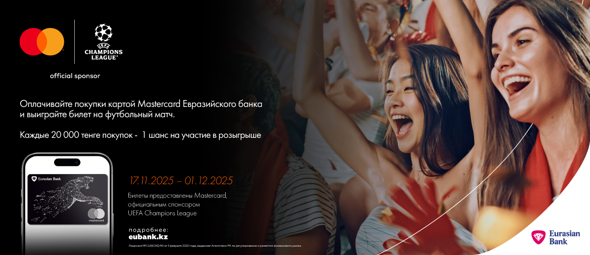 Евразийский банк совместно с Международной Платежной Системой Mastercard запускает акцию «Идём на матч «Кайрат» – «Олимпиакос» с Mastercard». Главный приз — билеты на матч «Кайрат» – «Олимпиакос», который состоится в г. Астана 9 декабря 2025 года.