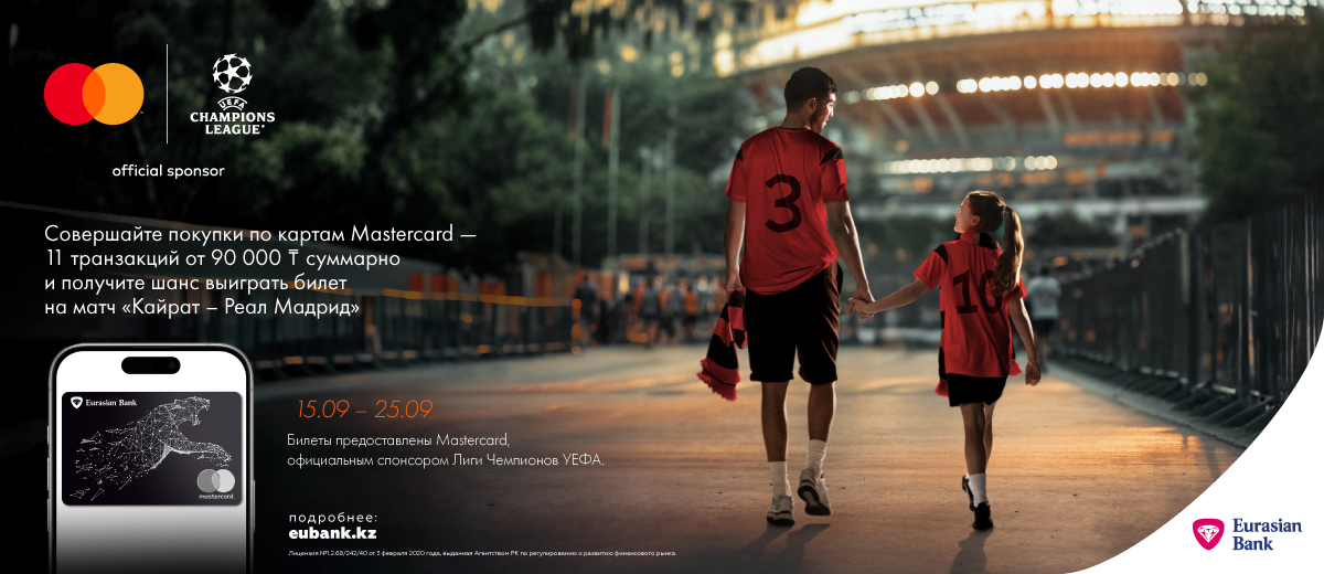 Евразийский банк совместно с международной платежной системой Mastercard запускает акцию «Идём на футбол вместе с Mastercard». Главный приз — билеты на исторический матч «Кайрат» – «Реал Мадрид», который состоится в Алматы 30 сентября 2025 года.