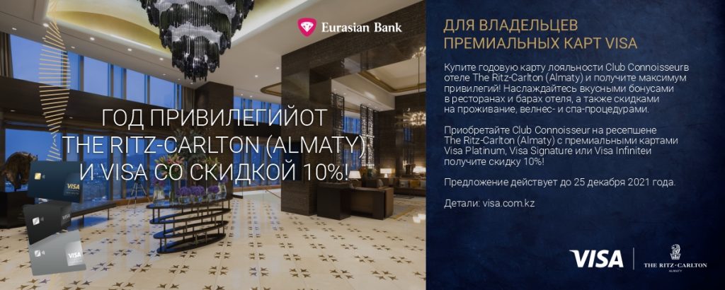 Приобретите годовую карту лояльности Club Connoisseur в отеле The Ritz-Carlton Almaty картой Visa Platinum или Infinite Евразийского банка и получите максимум привилегий.