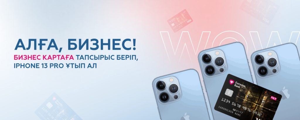 Еуразиялық банктің Бизнес картасының барлық ұстаушылары үшін науқан басталады! Бизнес карта ашыңыз — төрт iPhone 13 Pro-ның біреуін ұтып алу мүмкіндігіне ие болыңыз.