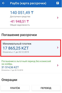 2. После того, как вы нажали на PayDa у вас есть выбор, оплатить «Минимальный платеж» или «Льготный платеж». В данной инструкции мы рассматриваем способ оплаты минимального платежа. Выберите «Минимальный платеж».