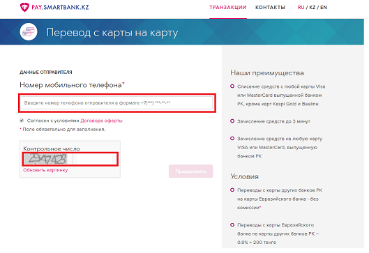 2. Укажите номер мобильного телефона отправителя денег, введите контрольное число, которое отобразит вам сайт и нажмите «Продолжить».