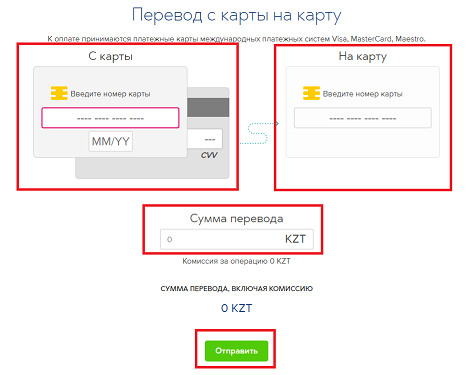 3. Далее, необходимо ввести данные карты, указать сумму перевода и нажать «Отправить».