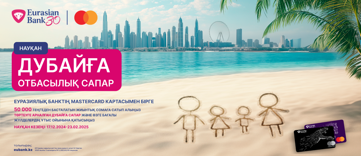 2024 жылғы 17 желтоқсаннан 2025 жылғы 23 ақпанға дейін Еуразиялық банк “Төрт адамға арналған Дубайға отбасылық саяхат” науқанын іске қосады. Науқан қатысушылары Apple Iphone 16 PRO, TUMI чемоданын, Dyson шаңсорғышы мен бас жүлде – Дубайға отбасылық саяхат!