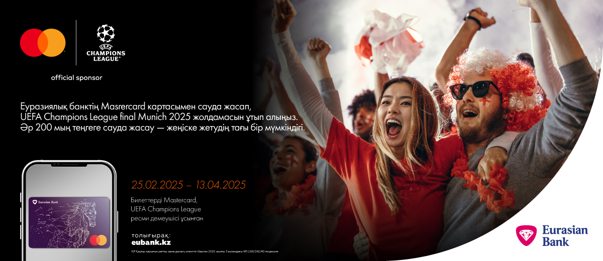 Еуразиялық банк пен Mastercard барлық футбол жанкүйерлерін “Mastercard-пен тамаша футбол” науқанына қатысып, Еуропаның басты футбол кубогының тағдырын шешетін турнирдің тарихи финалына арналған бірегей турды ұтып алуға шақырады.