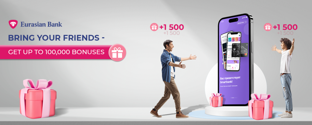 Get up to 100,000 bonuses by recommending friends and acquaintances to open a Eurasian Bank card. For each successful recommendation, you and your friend will receive 1,500 bonuses!