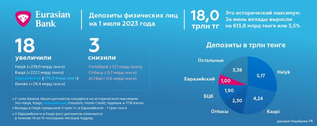 На 1 июля 2023 года портфель вкладов физических лиц (депозиты, текущие счета и карт-счета) превысил рекордные — 1 трлн тенге. За 6 месяцев текущего года они выросли на 155 млрд тенге. Это второй показатель по приросту в объеме среди всех банков РК.