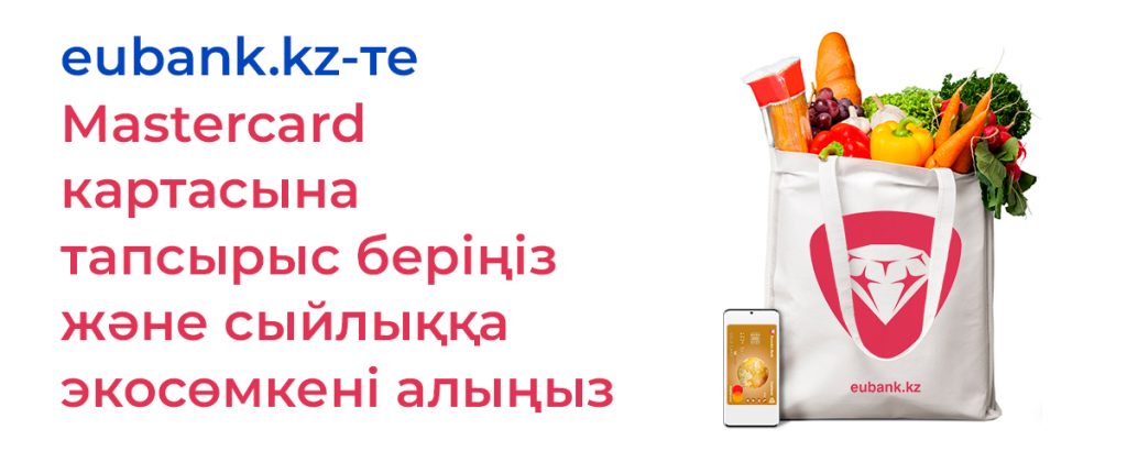 Еubank.kz-те Mastercard карталарына тапсырыс бергенде сыйлыққа экосөмке аласыз. Оны сізге картамен бірге жеткізіп береді.