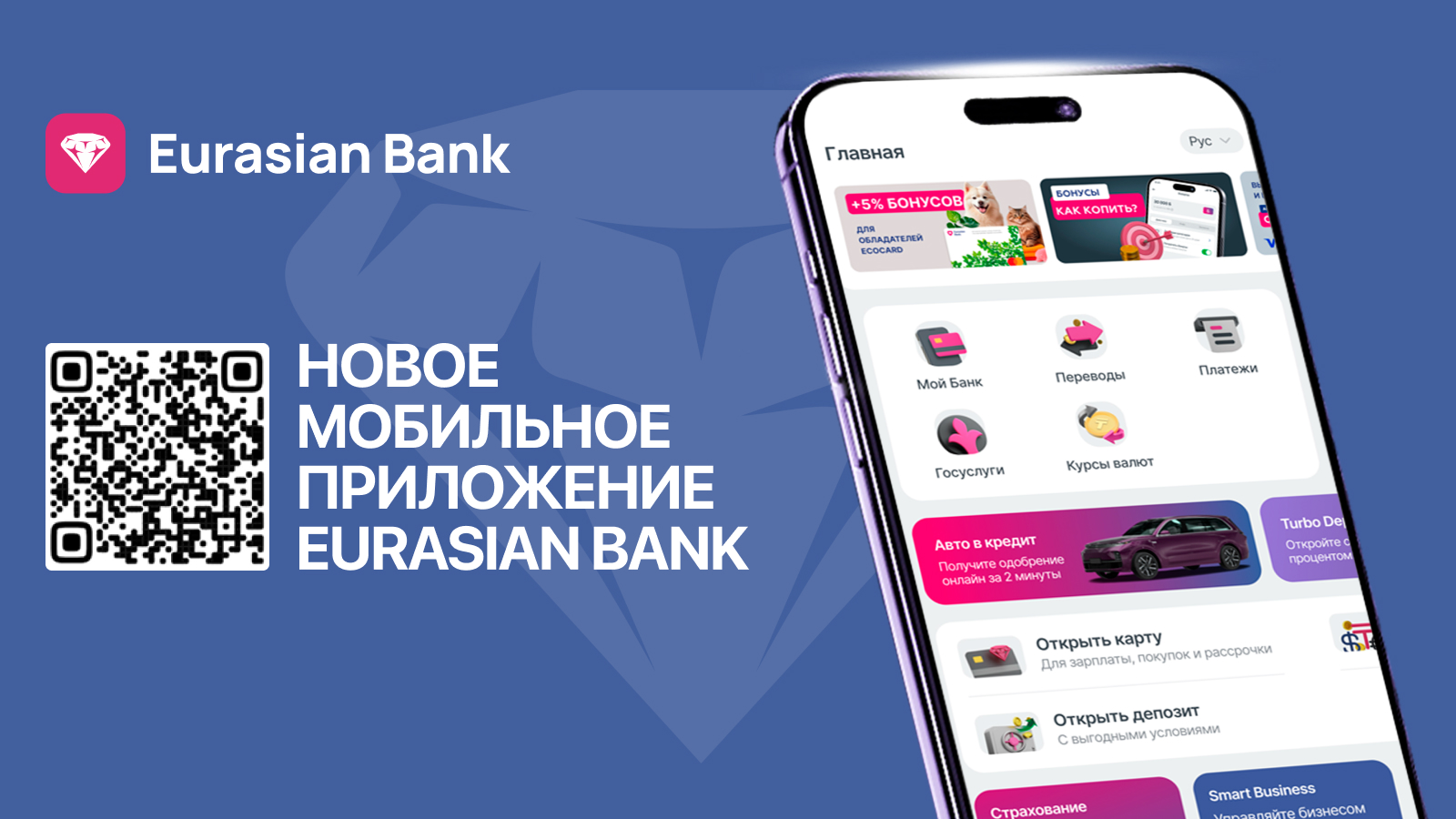 Евразийский банк запустил новое мобильное приложение Eurasian Bank, которое пришло на смену Smartbank. Это не обновление, это полностью новый продукт, построенный на современной технологической платформе и разработанный с учетом опыта использования предыдущей версии.