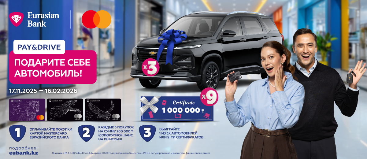 Совершайте покупки картой Mastercard Евразийского банка и получите шанс выиграть один из трёх автомобилей или девяти сертификатов на технику на сумму 1 000 000 тенге каждый!