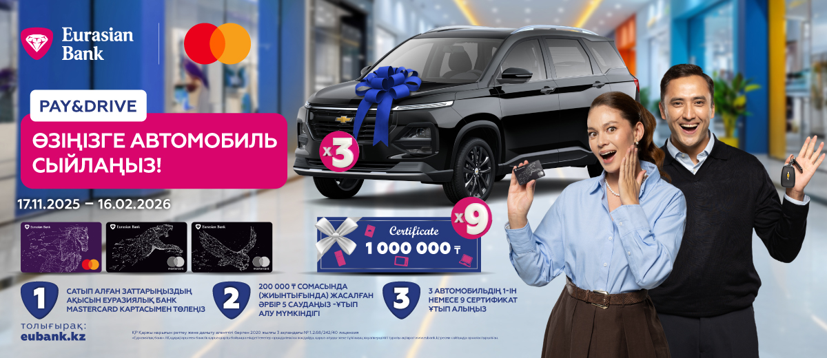 Еуразиялық банк Mastercard картасымен сауда жасап, үш автокөліктің бірін немесе әрқайсысы 1 000 000 теңге соманы құрайтын техникаға арналған тоғыз сертификаттың бірін ұтып алу мүмкіндігін алыңыз!