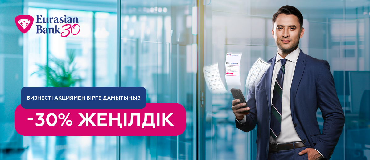 Еуразиялық банктің 30 жылдығына орай Сіздің бизнесіңіз үшін тиімді шарттармен “30% жеңілдік” акциясын пайдалану мүмкіндігін жіберіп алмаңыз!