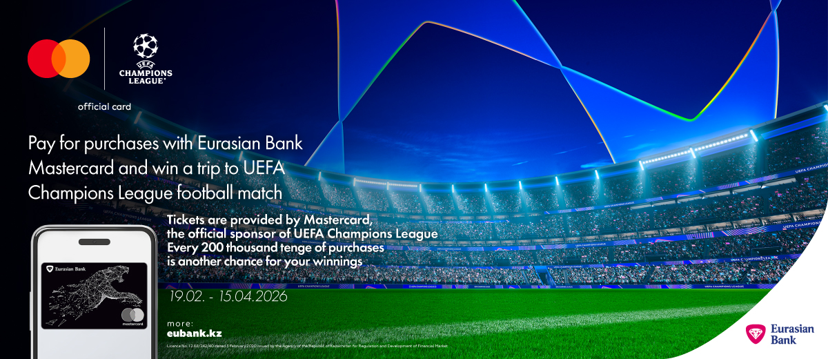 From 19 February to 15 April 2026, holders of Eurasian Bank Mastercard cards can participate in the Dream Match with Mastercard Promotion and win a tour to the UEFA Champions League Final in Budapest.